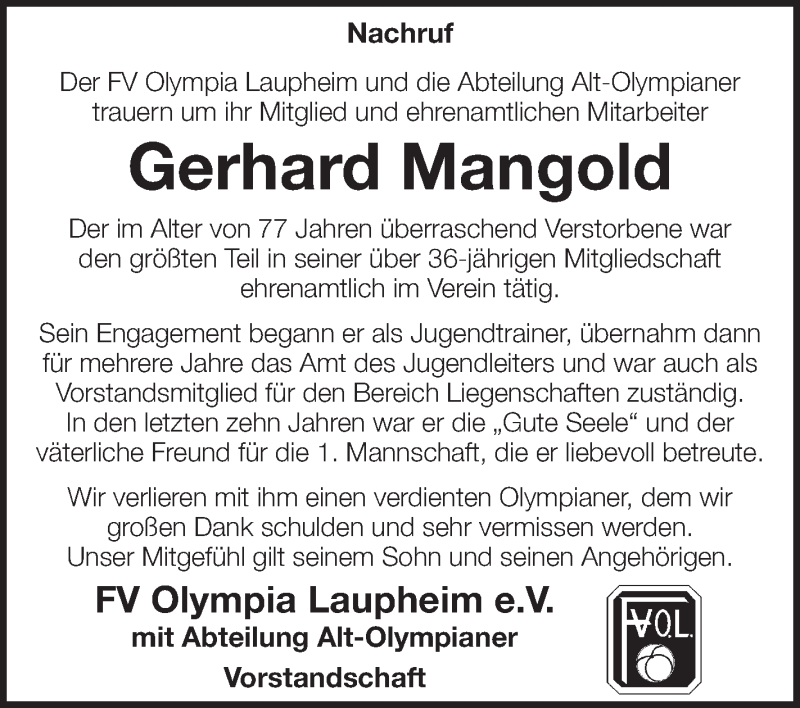 Hier finden Sie alle Traueranzeigen aus der Zeitung, die bisher für Gerhard Mangold erschienen sind. Weitere Traueranzeigen, die in der Zeitung erscheinen, werden hier ebenfalls aufgelistet
