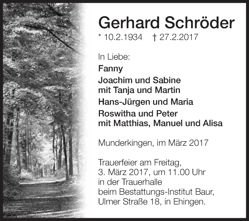 Hier finden Sie alle Traueranzeigen aus der Zeitung, die bisher für Gerhard Schröder erschienen sind. Weitere Traueranzeigen, die in der Zeitung erscheinen, werden hier ebenfalls aufgelistet
