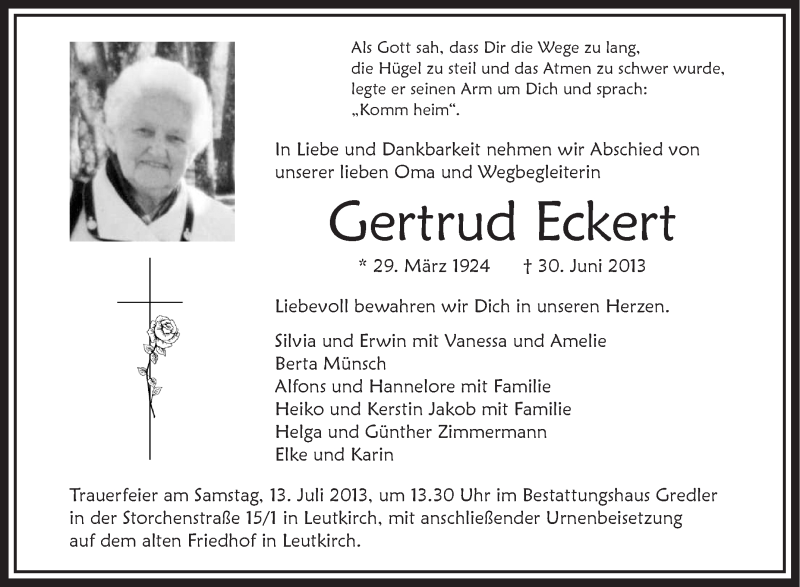 Hier finden Sie alle Traueranzeigen aus der Zeitung, die bisher für Gertrud Eckert erschienen sind. Weitere Traueranzeigen, die in der Zeitung erscheinen, werden hier ebenfalls aufgelistet