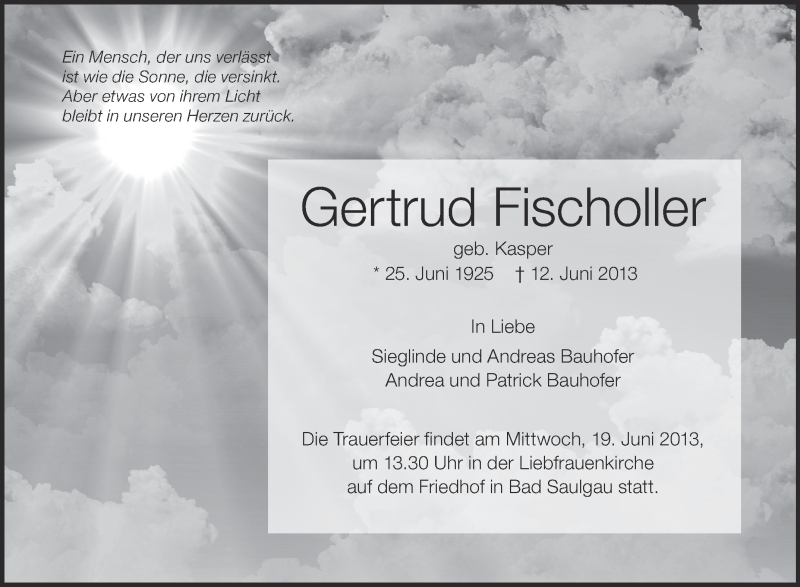 Hier finden Sie alle Traueranzeigen aus der Zeitung, die bisher für Gertrud Fischoller erschienen sind. Weitere Traueranzeigen, die in der Zeitung erscheinen, werden hier ebenfalls aufgelistet