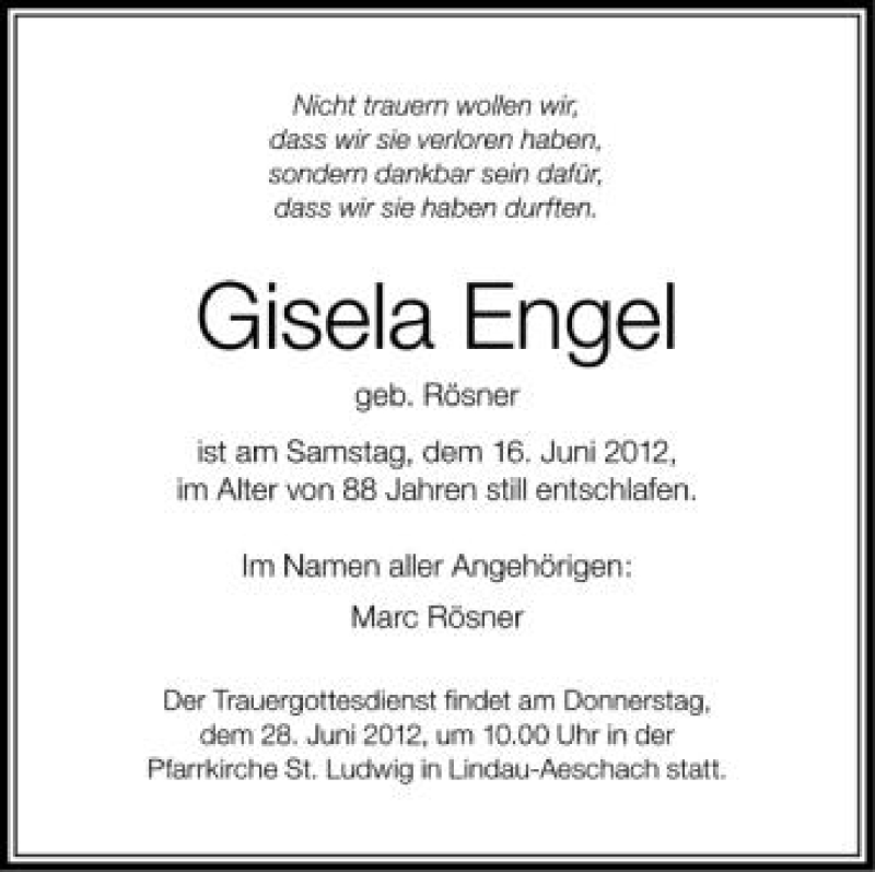 Hier finden Sie alle Traueranzeigen aus der Zeitung, die bisher für Gisela Engel erschienen sind. Weitere Traueranzeigen, die in der Zeitung erscheinen, werden hier ebenfalls aufgelistet