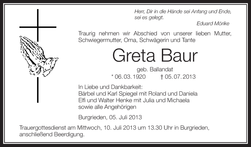 Hier finden Sie alle Traueranzeigen aus der Zeitung, die bisher für Greta Baur erschienen sind. Weitere Traueranzeigen, die in der Zeitung erscheinen, werden hier ebenfalls aufgelistet