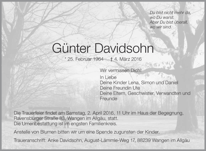 Hier finden Sie alle Traueranzeigen aus der Zeitung, die bisher für Günter Davidsohn erschienen sind. Weitere Traueranzeigen, die in der Zeitung erscheinen, werden hier ebenfalls aufgelistet