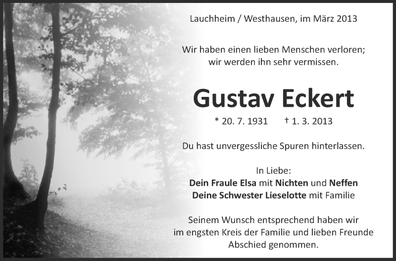 Hier finden Sie alle Traueranzeigen aus der Zeitung, die bisher für Gustav Eckert erschienen sind. Weitere Traueranzeigen, die in der Zeitung erscheinen, werden hier ebenfalls aufgelistet