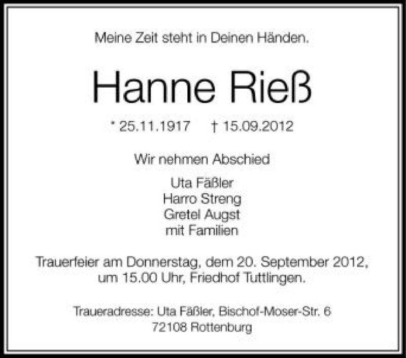 Hier finden Sie alle Traueranzeigen aus der Zeitung, die bisher für Hanne Rieß erschienen sind. Weitere Traueranzeigen, die in der Zeitung erscheinen, werden hier ebenfalls aufgelistet