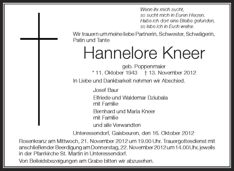 Hier finden Sie alle Traueranzeigen aus der Zeitung, die bisher für Hannelore Kneer erschienen sind. Weitere Traueranzeigen, die in der Zeitung erscheinen, werden hier ebenfalls aufgelistet