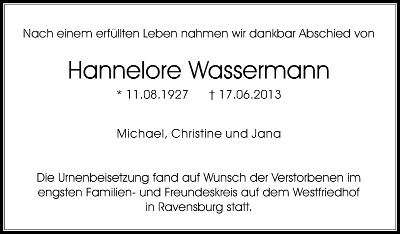 Hier finden Sie alle Traueranzeigen aus der Zeitung, die bisher für Hannelore Wassermann erschienen sind. Weitere Traueranzeigen, die in der Zeitung erscheinen, werden hier ebenfalls aufgelistet