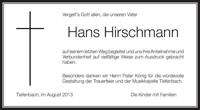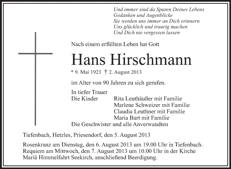 Hier finden Sie alle Traueranzeigen aus der Zeitung, die bisher für Hans Hirschmann erschienen sind. Weitere Traueranzeigen, die in der Zeitung erscheinen, werden hier ebenfalls aufgelistet