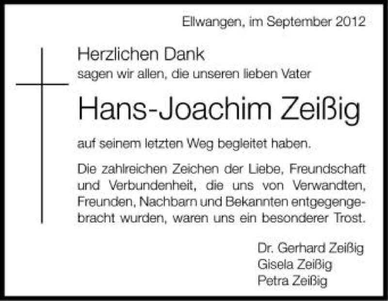 Hier finden Sie alle Traueranzeigen aus der Zeitung, die bisher für Hans-Joachim Zeißig erschienen sind. Weitere Traueranzeigen, die in der Zeitung erscheinen, werden hier ebenfalls aufgelistet