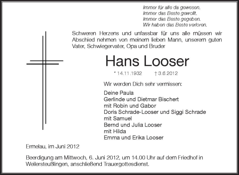 Hier finden Sie alle Traueranzeigen aus der Zeitung, die bisher für Hans Looser erschienen sind. Weitere Traueranzeigen, die in der Zeitung erscheinen, werden hier ebenfalls aufgelistet