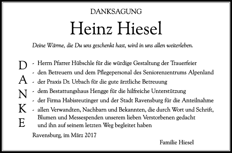 Hier finden Sie alle Traueranzeigen aus der Zeitung, die bisher für Heinz Hiesel erschienen sind. Weitere Traueranzeigen, die in der Zeitung erscheinen, werden hier ebenfalls aufgelistet