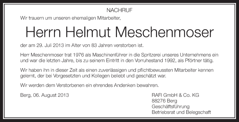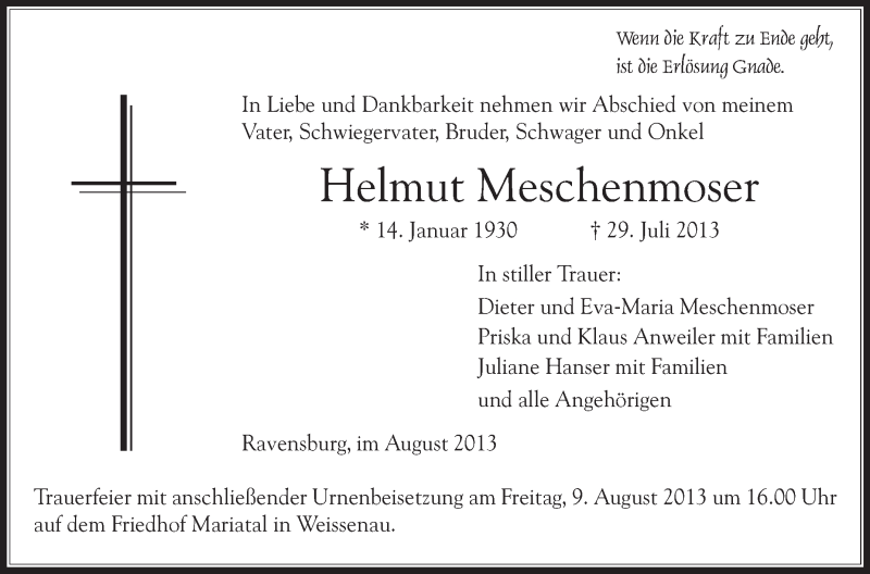 Hier finden Sie alle Traueranzeigen aus der Zeitung, die bisher für Helmut Meschenmoser erschienen sind. Weitere Traueranzeigen, die in der Zeitung erscheinen, werden hier ebenfalls aufgelistet