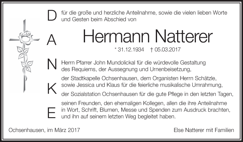 Hier finden Sie alle Traueranzeigen aus der Zeitung, die bisher für Hermann Natterer erschienen sind. Weitere Traueranzeigen, die in der Zeitung erscheinen, werden hier ebenfalls aufgelistet