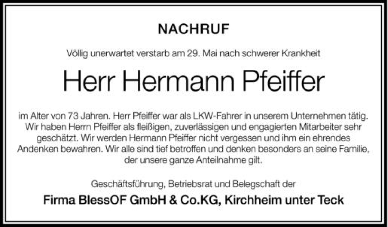 Hier finden Sie alle Traueranzeigen aus der Zeitung, die bisher für Hermann Pfeiffer erschienen sind. Weitere Traueranzeigen, die in der Zeitung erscheinen, werden hier ebenfalls aufgelistet