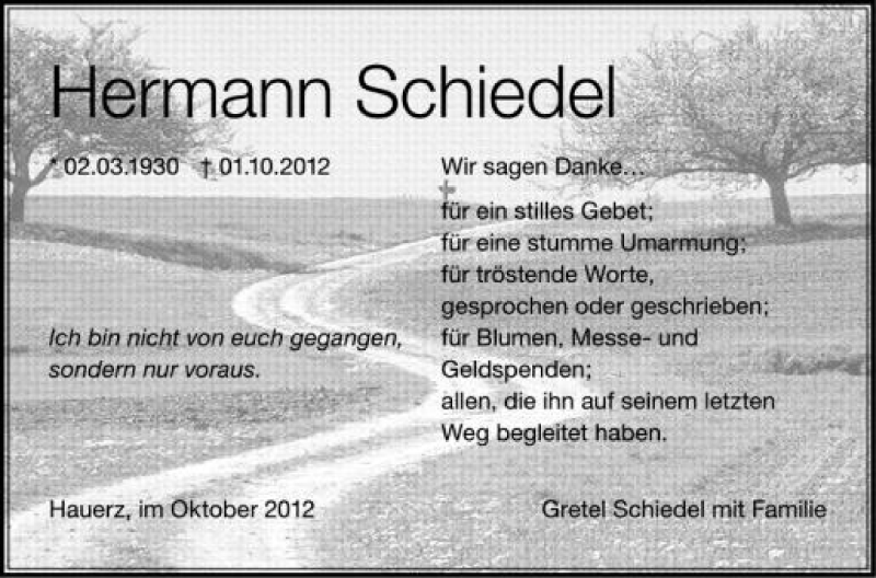 Hier finden Sie alle Traueranzeigen aus der Zeitung, die bisher für Hermann Schiedel erschienen sind. Weitere Traueranzeigen, die in der Zeitung erscheinen, werden hier ebenfalls aufgelistet