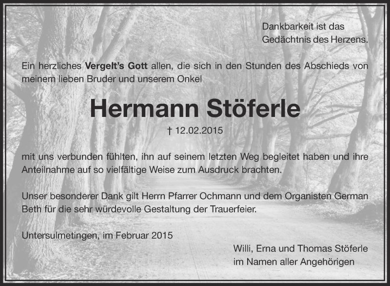 Hier finden Sie alle Traueranzeigen aus der Zeitung, die bisher für Hermann Stöferle erschienen sind. Weitere Traueranzeigen, die in der Zeitung erscheinen, werden hier ebenfalls aufgelistet