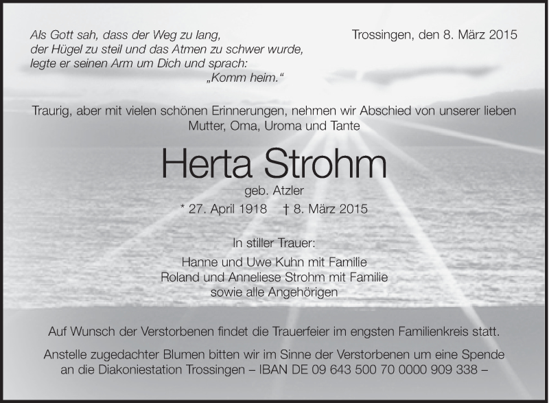 Hier finden Sie alle Traueranzeigen aus der Zeitung, die bisher für Herta Strohm erschienen sind. Weitere Traueranzeigen, die in der Zeitung erscheinen, werden hier ebenfalls aufgelistet