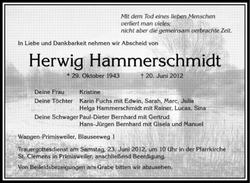 Hier finden Sie alle Traueranzeigen aus der Zeitung, die bisher für Herwig Hammerschmidt erschienen sind. Weitere Traueranzeigen, die in der Zeitung erscheinen, werden hier ebenfalls aufgelistet