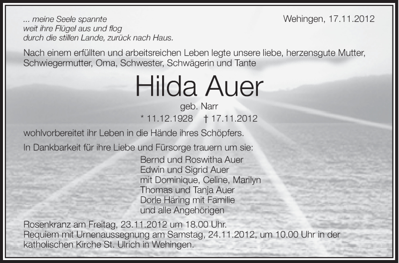 Hier finden Sie alle Traueranzeigen aus der Zeitung, die bisher für Hilda Auer erschienen sind. Weitere Traueranzeigen, die in der Zeitung erscheinen, werden hier ebenfalls aufgelistet