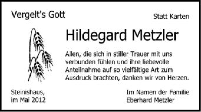 Hier finden Sie alle Traueranzeigen aus der Zeitung, die bisher für Hildegard Metzler erschienen sind. Weitere Traueranzeigen, die in der Zeitung erscheinen, werden hier ebenfalls aufgelistet