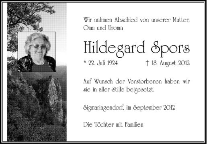 Hier finden Sie alle Traueranzeigen aus der Zeitung, die bisher für Hildegard Spors erschienen sind. Weitere Traueranzeigen, die in der Zeitung erscheinen, werden hier ebenfalls aufgelistet
