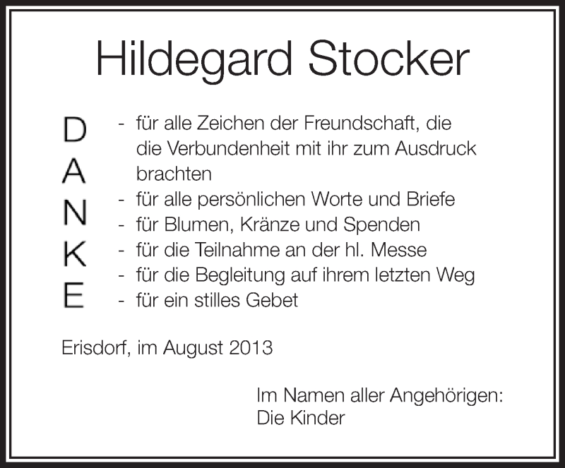 Hier finden Sie alle Traueranzeigen aus der Zeitung, die bisher für Hildegard Stocker erschienen sind. Weitere Traueranzeigen, die in der Zeitung erscheinen, werden hier ebenfalls aufgelistet