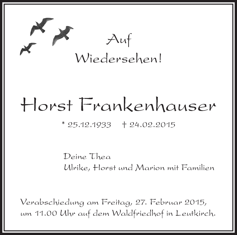 Hier finden Sie alle Traueranzeigen aus der Zeitung, die bisher für Horst Frankenhauser erschienen sind. Weitere Traueranzeigen, die in der Zeitung erscheinen, werden hier ebenfalls aufgelistet