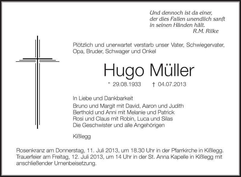 Hier finden Sie alle Traueranzeigen aus der Zeitung, die bisher für Hugo Müller erschienen sind. Weitere Traueranzeigen, die in der Zeitung erscheinen, werden hier ebenfalls aufgelistet