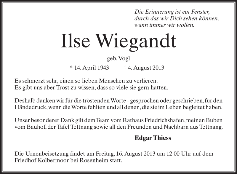 Hier finden Sie alle Traueranzeigen aus der Zeitung, die bisher für Ilse Wiegandt erschienen sind. Weitere Traueranzeigen, die in der Zeitung erscheinen, werden hier ebenfalls aufgelistet