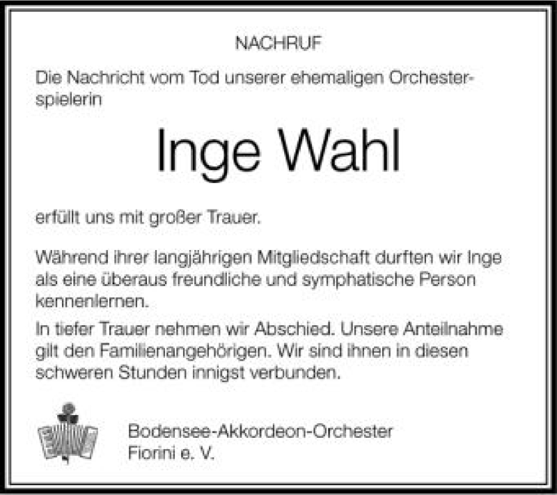 Hier finden Sie alle Traueranzeigen aus der Zeitung, die bisher für Inge Wahl erschienen sind. Weitere Traueranzeigen, die in der Zeitung erscheinen, werden hier ebenfalls aufgelistet