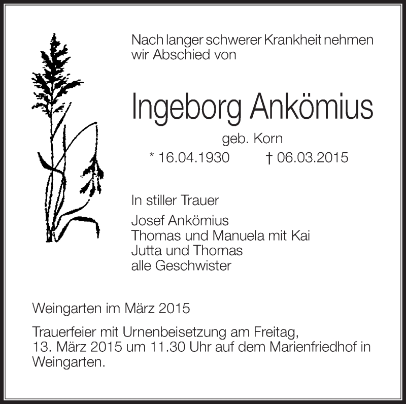 Hier finden Sie alle Traueranzeigen aus der Zeitung, die bisher für Ingeborg Ankömius erschienen sind. Weitere Traueranzeigen, die in der Zeitung erscheinen, werden hier ebenfalls aufgelistet