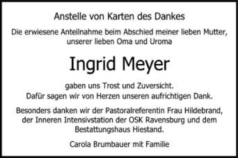 Hier finden Sie alle Traueranzeigen aus der Zeitung, die bisher für Ingrid Meyer erschienen sind. Weitere Traueranzeigen, die in der Zeitung erscheinen, werden hier ebenfalls aufgelistet