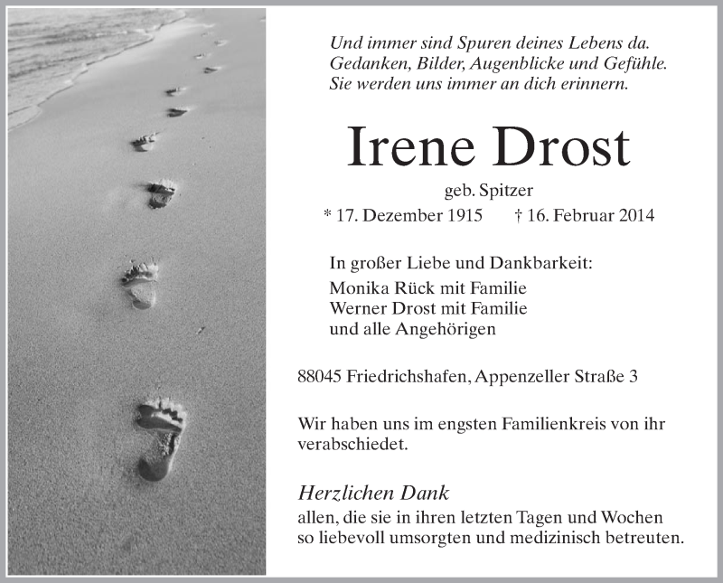Hier finden Sie alle Traueranzeigen aus der Zeitung, die bisher für Irene Drost erschienen sind. Weitere Traueranzeigen, die in der Zeitung erscheinen, werden hier ebenfalls aufgelistet