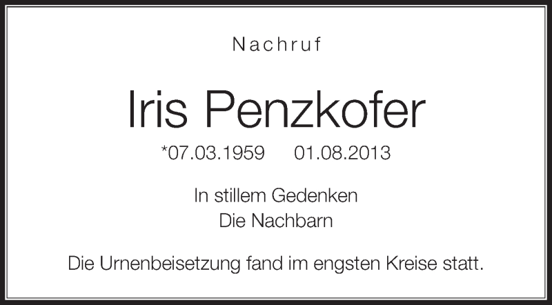 Hier finden Sie alle Traueranzeigen aus der Zeitung, die bisher für Iris Penzkofer erschienen sind. Weitere Traueranzeigen, die in der Zeitung erscheinen, werden hier ebenfalls aufgelistet