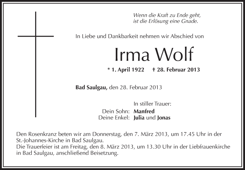 Hier finden Sie alle Traueranzeigen aus der Zeitung, die bisher für Irma Wolf erschienen sind. Weitere Traueranzeigen, die in der Zeitung erscheinen, werden hier ebenfalls aufgelistet