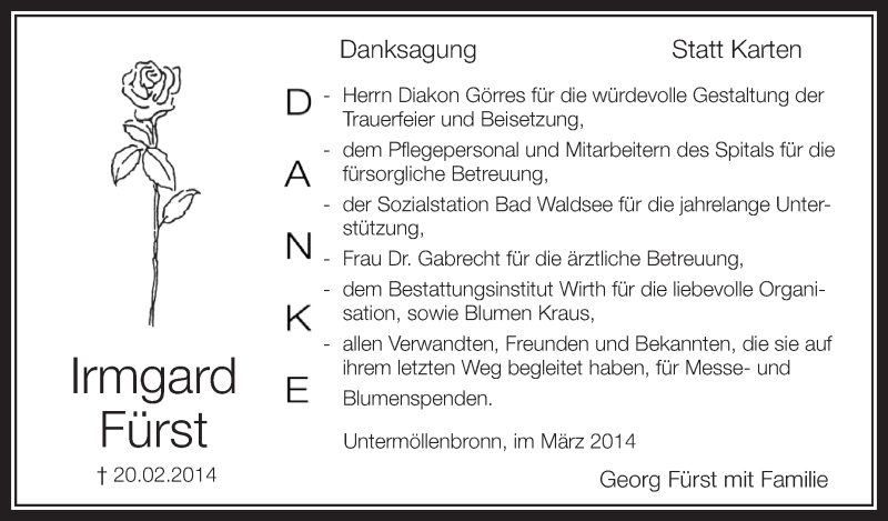 Hier finden Sie alle Traueranzeigen aus der Zeitung, die bisher für Irmgard Fürst erschienen sind. Weitere Traueranzeigen, die in der Zeitung erscheinen, werden hier ebenfalls aufgelistet