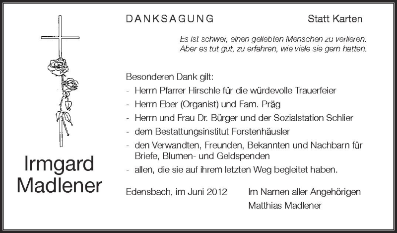 Hier finden Sie alle Traueranzeigen aus der Zeitung, die bisher für Irmgard Madlener erschienen sind. Weitere Traueranzeigen, die in der Zeitung erscheinen, werden hier ebenfalls aufgelistet
