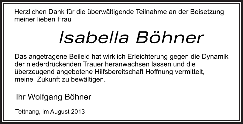 Hier finden Sie alle Traueranzeigen aus der Zeitung, die bisher für Isabella Böhner erschienen sind. Weitere Traueranzeigen, die in der Zeitung erscheinen, werden hier ebenfalls aufgelistet