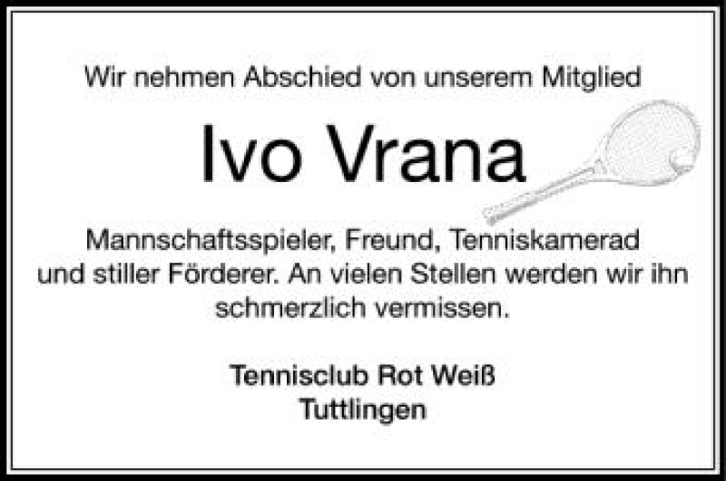 Hier finden Sie alle Traueranzeigen aus der Zeitung, die bisher für Ivo Vrana erschienen sind. Weitere Traueranzeigen, die in der Zeitung erscheinen, werden hier ebenfalls aufgelistet