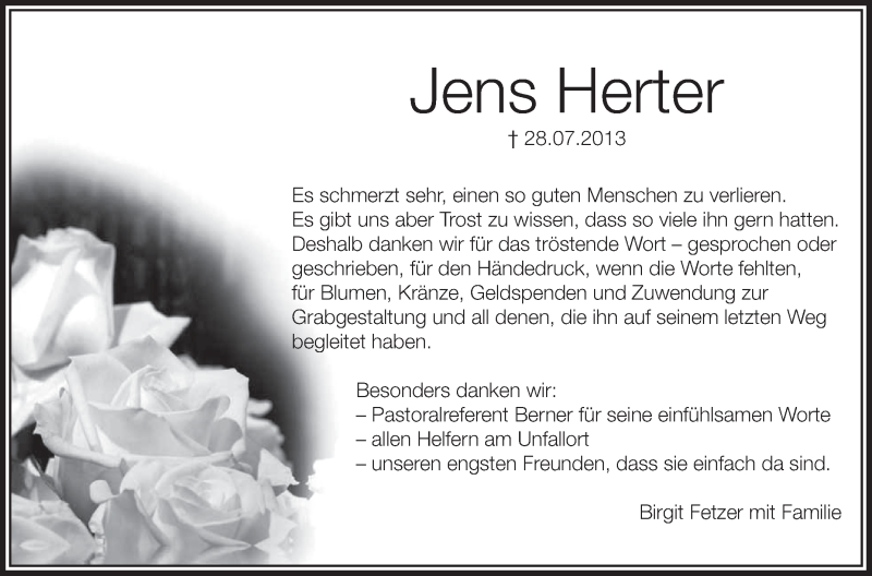 Hier finden Sie alle Traueranzeigen aus der Zeitung, die bisher für Jens Herter erschienen sind. Weitere Traueranzeigen, die in der Zeitung erscheinen, werden hier ebenfalls aufgelistet