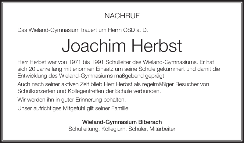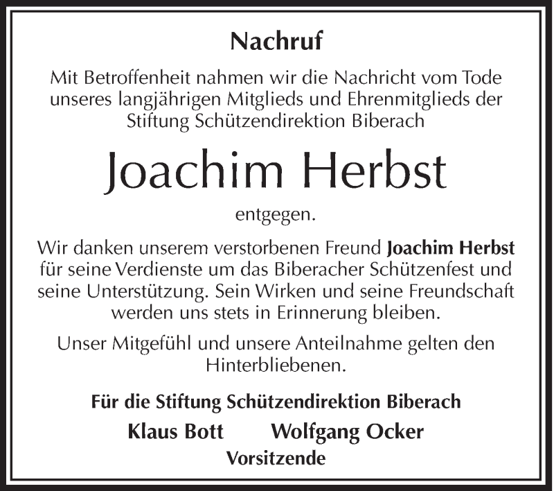 Hier finden Sie alle Traueranzeigen aus der Zeitung, die bisher für Joachim Herbst erschienen sind. Weitere Traueranzeigen, die in der Zeitung erscheinen, werden hier ebenfalls aufgelistet