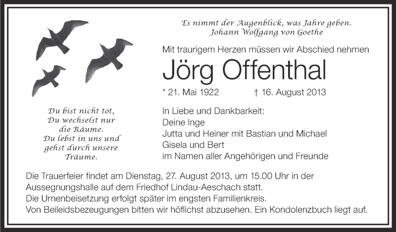 Hier finden Sie alle Traueranzeigen aus der Zeitung, die bisher für Jörg Offenthal erschienen sind. Weitere Traueranzeigen, die in der Zeitung erscheinen, werden hier ebenfalls aufgelistet