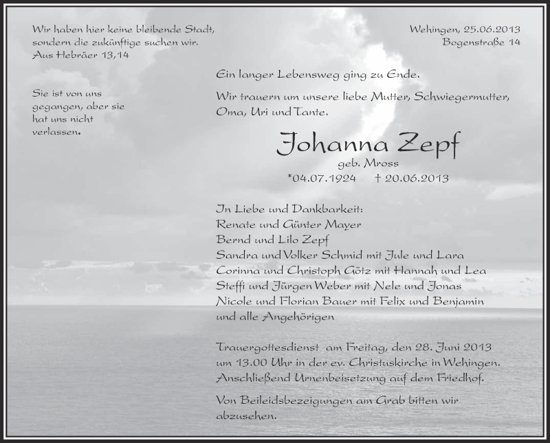 Hier finden Sie alle Traueranzeigen aus der Zeitung, die bisher für Johanna Zepf erschienen sind. Weitere Traueranzeigen, die in der Zeitung erscheinen, werden hier ebenfalls aufgelistet