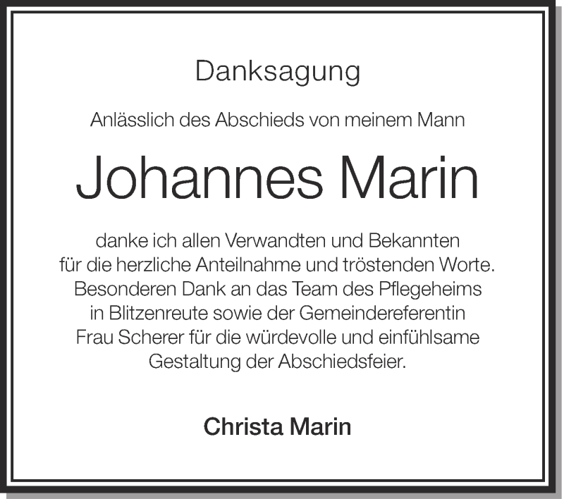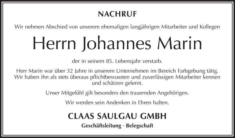 Hier finden Sie alle Traueranzeigen aus der Zeitung, die bisher für Johannes Marin erschienen sind. Weitere Traueranzeigen, die in der Zeitung erscheinen, werden hier ebenfalls aufgelistet