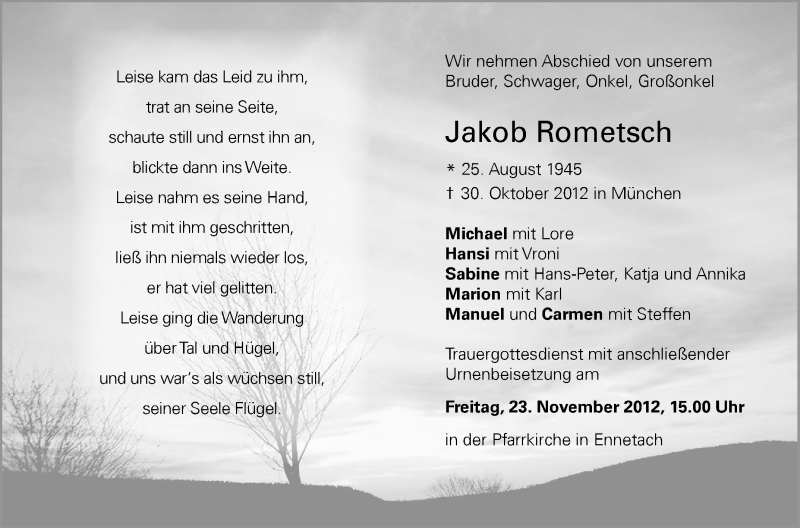 Hier finden Sie alle Traueranzeigen aus der Zeitung, die bisher für Jokob Rometsch erschienen sind. Weitere Traueranzeigen, die in der Zeitung erscheinen, werden hier ebenfalls aufgelistet