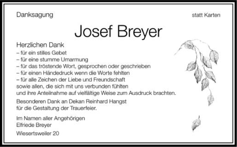 Hier finden Sie alle Traueranzeigen aus der Zeitung, die bisher für Josef Breyer erschienen sind. Weitere Traueranzeigen, die in der Zeitung erscheinen, werden hier ebenfalls aufgelistet