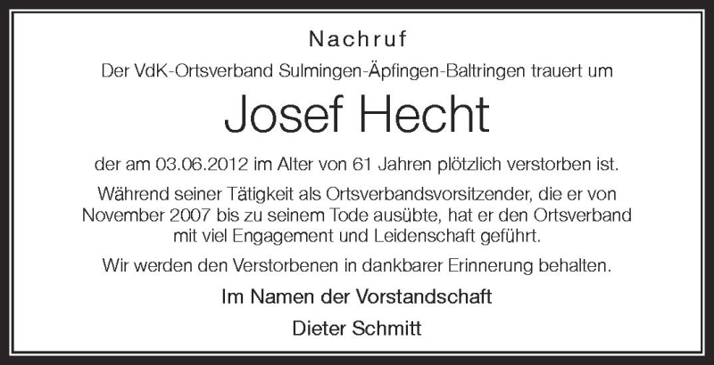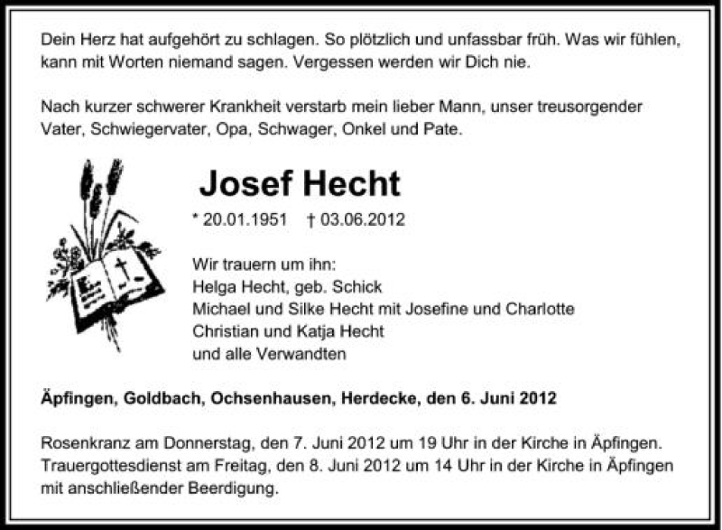 Hier finden Sie alle Traueranzeigen aus der Zeitung, die bisher für Josef Hecht erschienen sind. Weitere Traueranzeigen, die in der Zeitung erscheinen, werden hier ebenfalls aufgelistet