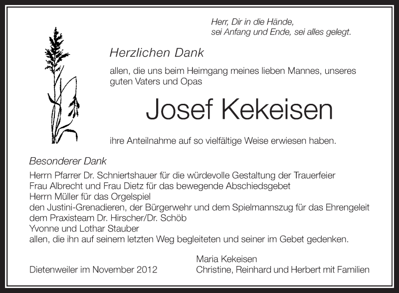 Hier finden Sie alle Traueranzeigen aus der Zeitung, die bisher für Josef Kekeisen erschienen sind. Weitere Traueranzeigen, die in der Zeitung erscheinen, werden hier ebenfalls aufgelistet