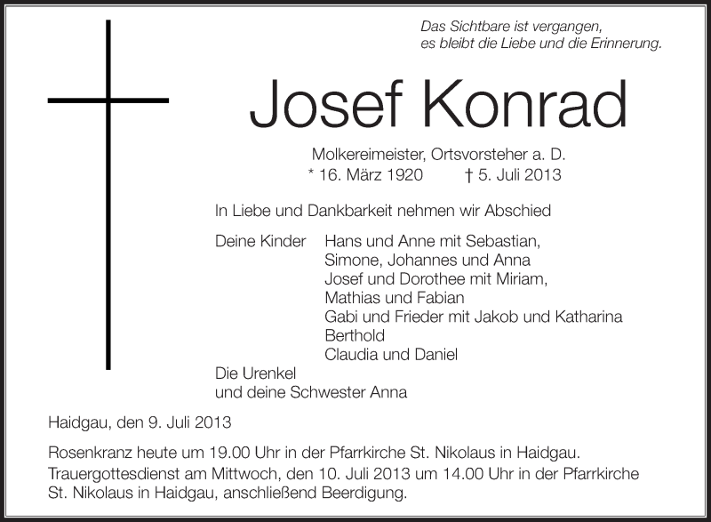 Hier finden Sie alle Traueranzeigen aus der Zeitung, die bisher für Josef Konrad erschienen sind. Weitere Traueranzeigen, die in der Zeitung erscheinen, werden hier ebenfalls aufgelistet