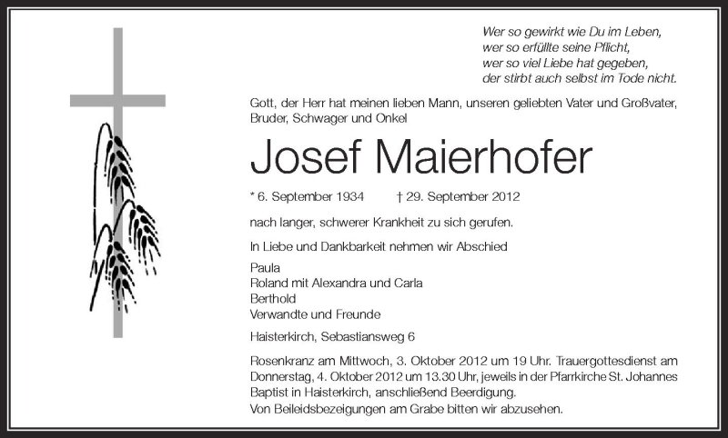 Hier finden Sie alle Traueranzeigen aus der Zeitung, die bisher für Josef Maierhofer erschienen sind. Weitere Traueranzeigen, die in der Zeitung erscheinen, werden hier ebenfalls aufgelistet